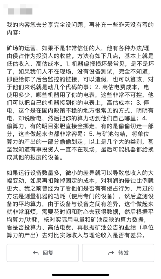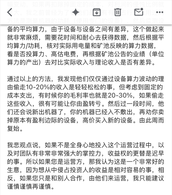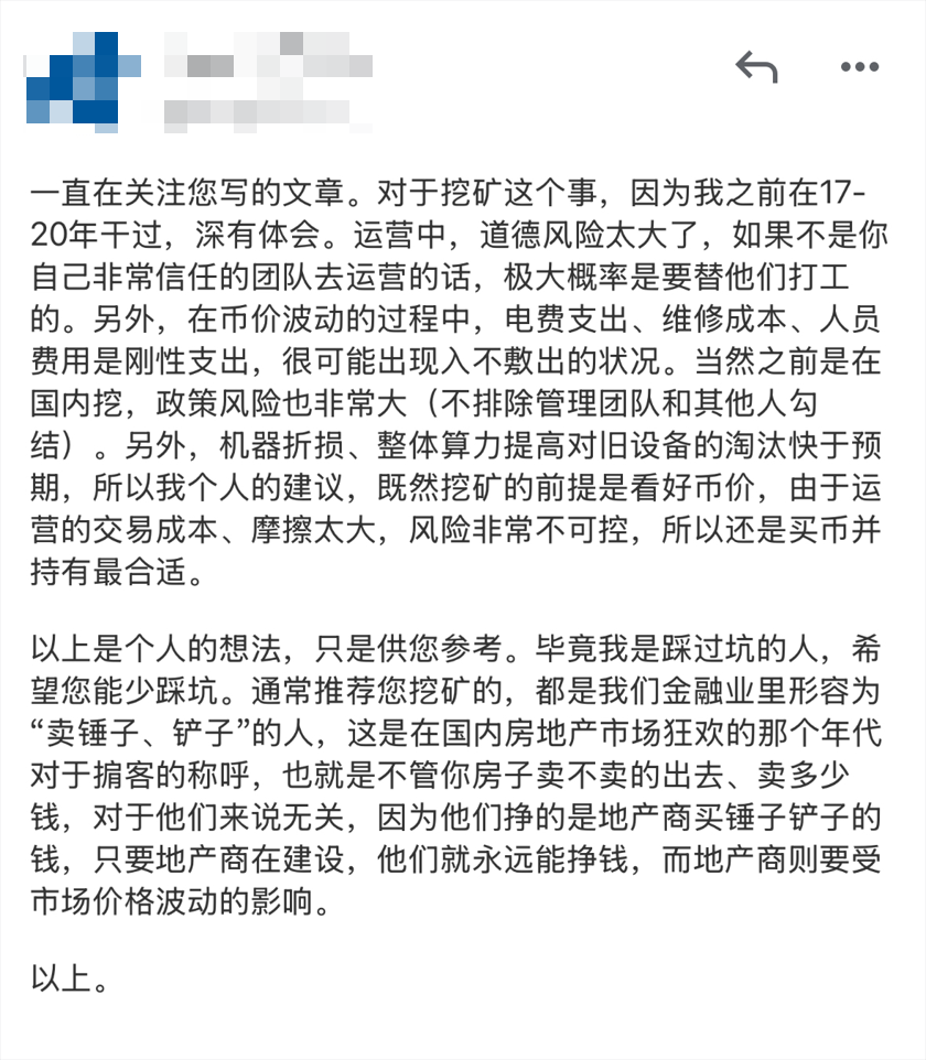 这次的挖矿系列炸出了不少潜水的老粉,尤其有一位N年前就专业挖矿的,发自肺腑地给我们分享了一下的他的经历,之后我们交流得非常愉快,所以在这必须喊一嗓子,但凡哪位看到我们的什么内容自己有过经历的或是有故事的或是有风险低回报高周期短的好路子的,热烈欢迎找我们交流,我们可以帮你分享给四万粉丝,有价值的内容就是应该被尽可能多的人看到!