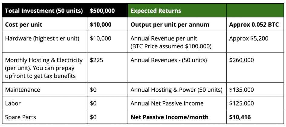 这个预测里面几个重要参数我翻译一下😂顶配的每台矿机1万一台,每年能挖大概0.052枚比特币。同时,每个月每台矿机的电费修理费维护费等等等等是一口价,$225。要开始挖,你买一台都行,如果你想一年挖一枚,就要差不多20台,反正丰俭由人,想咋干咋干。上面这个例子里面是50台矿机,如果就是一台矿机最简单这么算一下,assuming每枚比特币是10万,也就是买一台矿机+一年的电费等用了0.127枚币,每年挖0.052枚币,那用币本位也就是按币的数量来算的话,预期年回报率是每年40%-50%;如果按金本位,币价没有变动还是10万的情况下,预期回报率也是40%-50%; 如果按金本位币价有波动,那么(不精确)大概来说,币价在5万-6万以下的时候,挖矿是赔钱的,不如买币;如果币价在5万-6万的时候,挖矿基本上是不赔不赚的;币价在6万以上的时候,别人买币是零售价,你通过挖矿获得的币就是5万-6万左右的批发价,那就很爽了。现在10万的币价和5万的挖矿成本,币本身年回报就是上面算的,大概40%-50%,也就是2年-2年半左右回本。