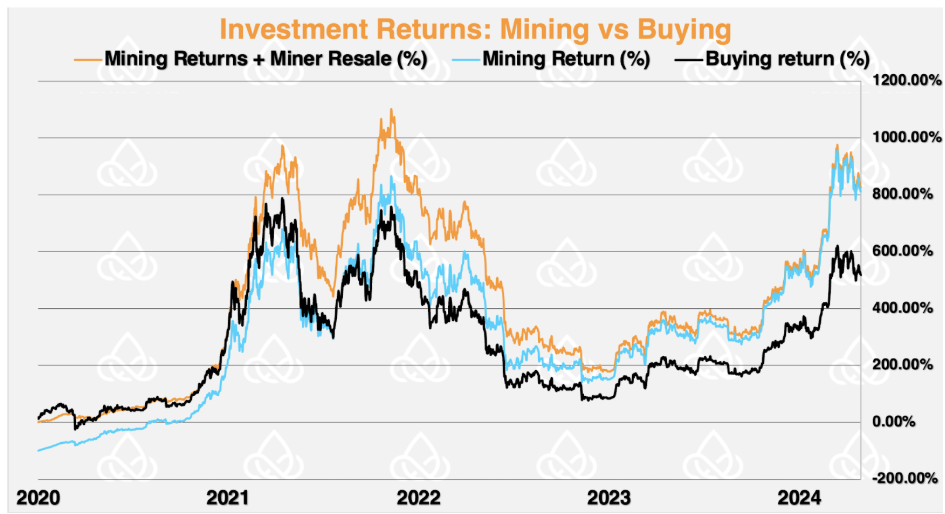我接着翻译😂也就是说,从2020到2024年,持有比特币的总回报大概在500%+ (也就是年回报大概100%+), 如果是挖矿总回报大概是800%+ (也就是年回报大概150%+), 如果是挖矿之后也同时卖了矿机,总回报则是900% (也就是年回报大概200%+)😂当然,他们做的图肯定是截取回报率最好的那段时间,也就是完美地低买高卖那一段(所以矿机也能卖高价),所以也不要太执着于这个目标。对我自己而言,从100%腰斩到50%的回报我都愿意尝试,当然,还是遵循我以往的原则,小额分散大量尝试,让时间筛选出赢家,每年盘一次,赚了继续加仓,亏了止损。